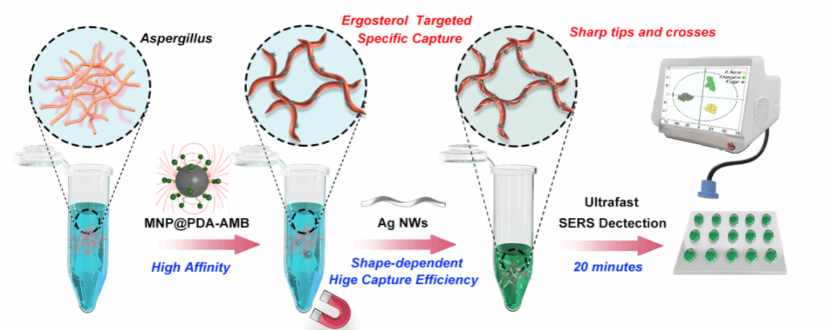 曲霉菌感染因其孢子易扩散、环境适应性强,较其他真菌更难防治。侵袭性曲霉病并发症严重,死亡率高达85.2%,临床诊断若出现延误将严重影响治疗成效。目前诊断主要依赖实验室检测,因此发展快速、准确的早期诊断方法至关重要。表面增强拉曼散射(SERS)技术虽在真菌检测中表现出潜力,但由于现有SERS基底选择性不足,其在曲霉菌特异性检测中的应用受到限制。本研究基于抗真菌药物两性霉素B(AMB)与曲霉菌细胞壁麦角甾醇特异性结合的机制,以具有高黏附性的聚多巴胺(PDA)为捕获载体,磁性纳米颗粒(MNP)为磁响应核心,通过原位聚合构建了MNP@PDA-AMB纳米捕获器。该纳米捕获器兼具高亲和力与高捕获效率,结合银纳米线(AgNWs)SERS基底,实现了曲霉菌的高灵敏、高特异性检测。整个检测过程仅需20分钟,其中捕获时间短至8分钟,检测限达到10–10⟡ cells/mL,且重现性良好(RSD < 10%)。该方法为曲霉菌的快速体外诊断提供了新策略,具有广泛的适应性与临床应用前景。